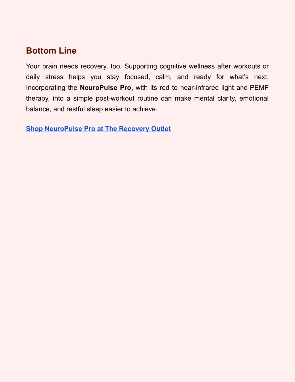 3. Bottom Line Your brain needs recovery, too. Supporting cognitive wellness after workouts or daily stress helps you stay focused, calm, and ready for what’s next. Incorporating the NeuroPulse Pro, with its red to near-infrared light and PEMF therapy, into a simple post-workout routine can make mental clarity, emotional balance, and restful sleep easier to achieve. Shop NeuroPulse Pro at The Recovery Outlet