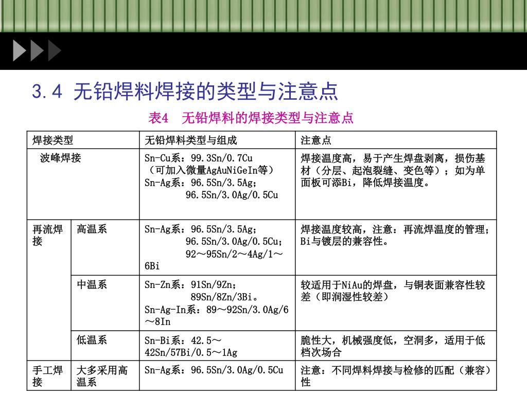 3.4 无铅焊料焊接的类型与注意点 表4 无铅焊料的焊接类型与注意点