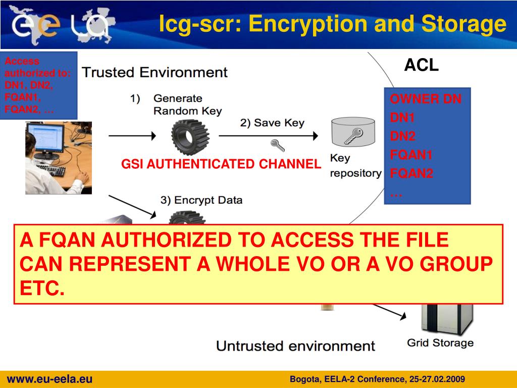 ACL OWNER DN DN1 DN2 FQAN1 FQAN2 … lcg-scr: Encryption and Storage Access authorized to: DN1, DN2, FQAN1, FQAN2, … GSI AUTHENTICATED CHANNEL A FQAN AUTHORIZED TO ACCESS THE FILE CAN REPRESENT A WHOLE VO OR A VO GROUP ETC. Bogota, EELA-2 Conference, 25-27.02.2009
