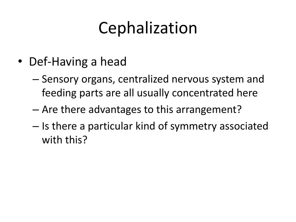 Cephalization • Def-Having a head • Sensory organs, centralized nervous system and feeding parts are all usually concentrated here • Are there advantages to this arrangement? • Is there a particular kind of symmetry associated with this?
