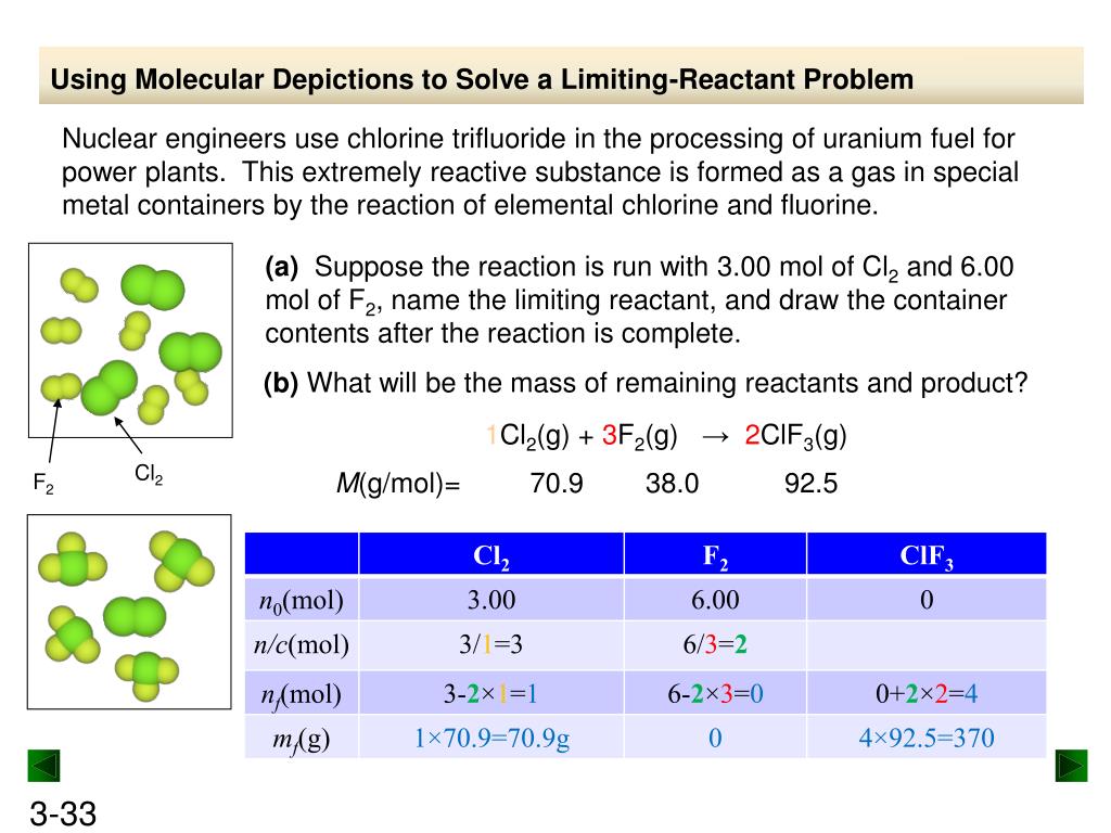 Cl2 F2 Using Molecular Depictions to Solve a Limiting-Reactant Problem Nuclear engineers use chlorine trifluoride in the processing of uranium fuel for power plants. This extremely reactive substance is formed as a gas in special metal containers by the reaction of elemental chlorine and fluorine. (a) Suppose the reaction is run with 3.00 mol of Cl2 and 6.00 mol of F2, name the limiting reactant, and draw the container contents after the reaction is complete. (b)What will be the mass of remaining reactants and product? 1Cl2(g) + 3F2(g) → 2ClF3(g) M(g/mol)= 70.9 38.0 92.5