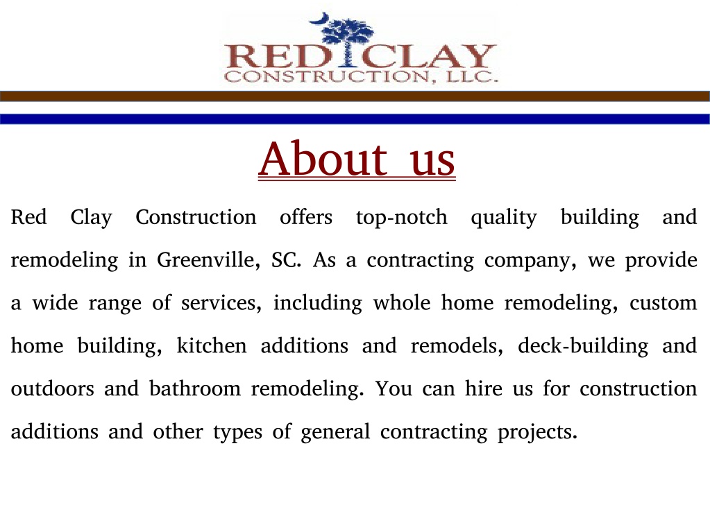 About us Red Clay Construction offers top-notch quality building and remodeling in Greenville, SC. As a contracting company, we provide a wide range of services, including whole home remodeling, custom home building, kitchen additions and remodels, deck-building and outdoors and bathroom remodeling. You can hire us for construction additions and other types of general contracting projects.