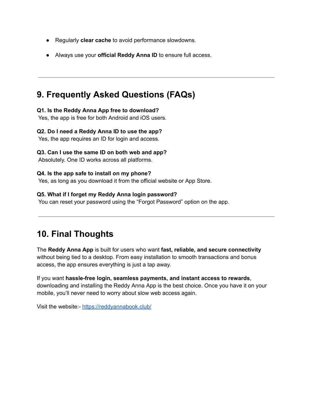 ● Regularly clear cache to avoid performance slowdowns. ● Always use your official Reddy Anna ID to ensure full access. 9. Frequently Asked Questions (FAQs) Q1. Is the Reddy Anna App free to download? Yes, the app is free for both Android and iOS users. Q2. Do I need a Reddy Anna ID to use the app? Yes, the app requires an ID for login and access. Q3. Can I use the same ID on both web and app? Absolutely. One ID works across all platforms. Q4. Is the app safe to install on my phone? Yes, as long as you download it from the official website or App Store. Q5. What if I forget my Reddy Anna login password? You can reset your password using the “Forgot Password” option on the app. 10. Final Thoughts The Reddy Anna App is built for users who want fast, reliable, and secure connectivity without being tied to a desktop. From easy installation to smooth transactions and bonus access, the app ensures everything is just a tap away. If you want hassle-free login, seamless payments, and instant access to rewards, downloading and installing the Reddy Anna App is the best choice. Once you have it on your mobile, you’ll never need to worry about slow web access again. Visit the website:- https://reddyannabook.club/