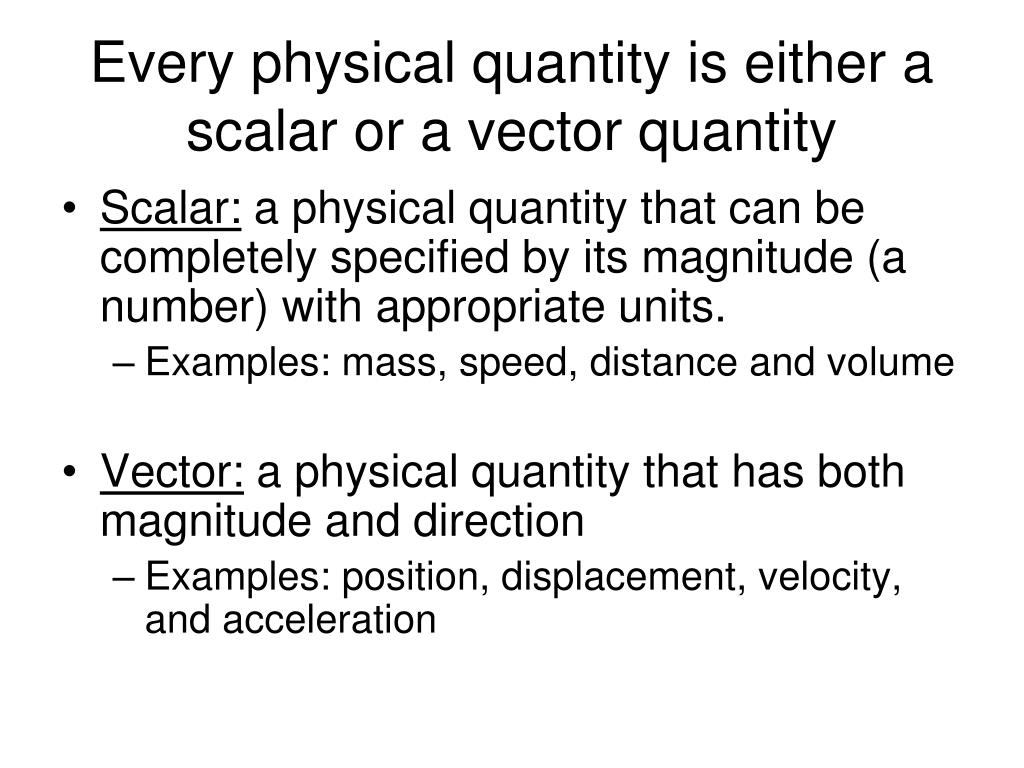 Every physical quantity is either a scalar or a vector quantity • Scalar: a physical quantity that can be completely specified by its magnitude (a number) with appropriate units. • Examples: mass, speed, distance and volume • Vector: a physical quantity that has both magnitude and direction • Examples: position, displacement, velocity, and acceleration