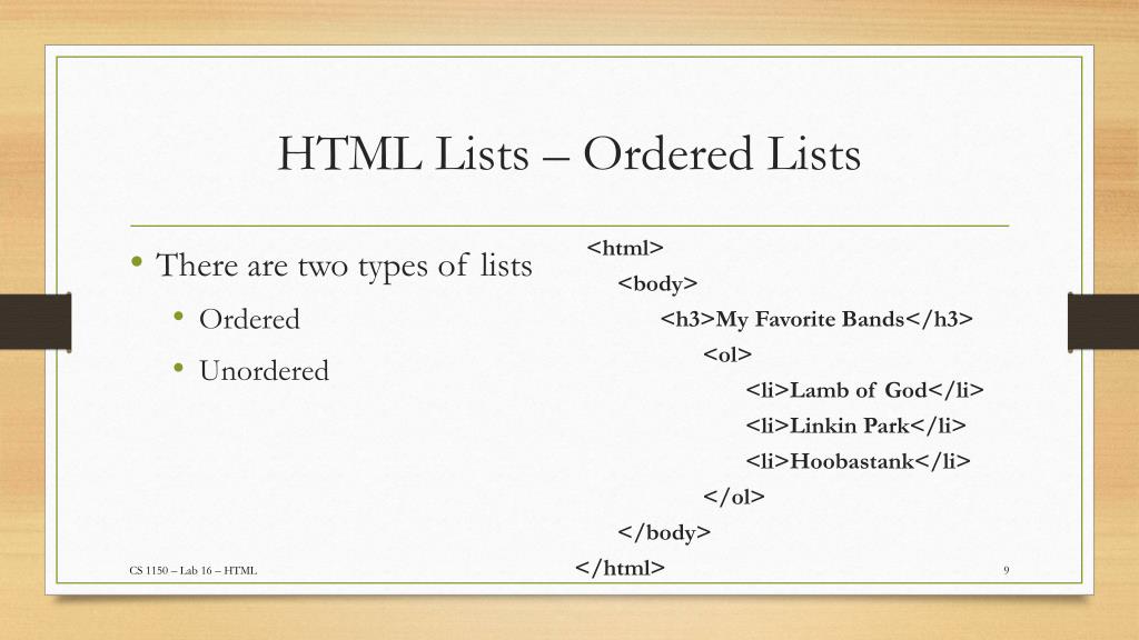 HTML Lists – Ordered Lists <html> <body> <h3>My Favorite Bands</h3> <ol> <li>Lamb of God</li> <li>Linkin Park</li> <li>Hoobastank</li> </ol> </body> </html> • There are two types of lists • Ordered • Unordered CS 1150 – Lab 16 – HTML
