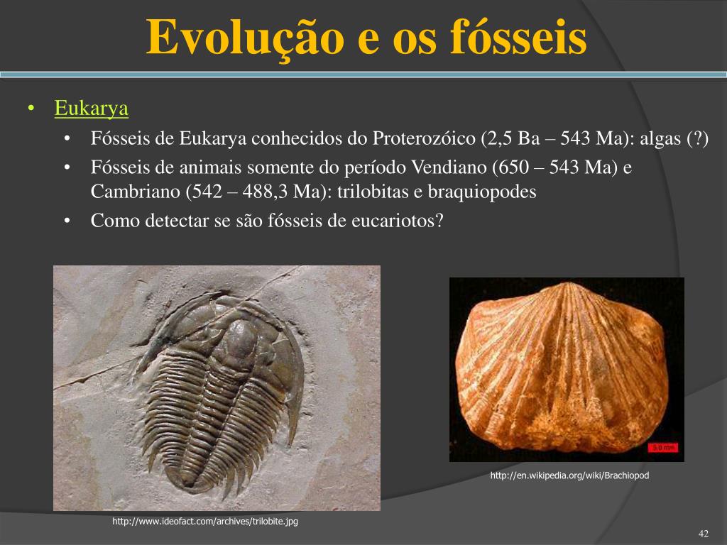 Evolução e os fósseis • Eukarya • Presença de esteranos (produtos de esteróis das membranas) – precursor dos esteróis http://en.wikipedia.org/wiki/Brachiopod