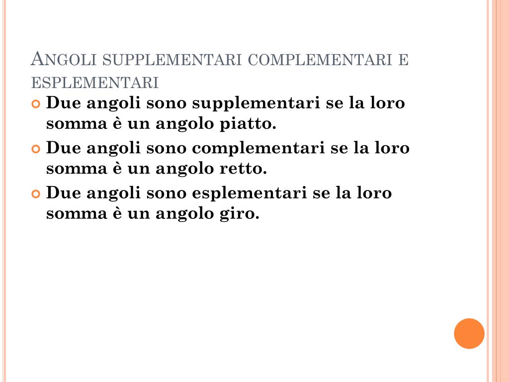 Angoli supplementari complementari e esplementari • Due angoli sono supplementari se la loro somma è un angolo piatto. • Due angoli sono complementari se la loro somma è un angolo retto. • Due angoli sono esplementari se la loro somma è un angolo giro.