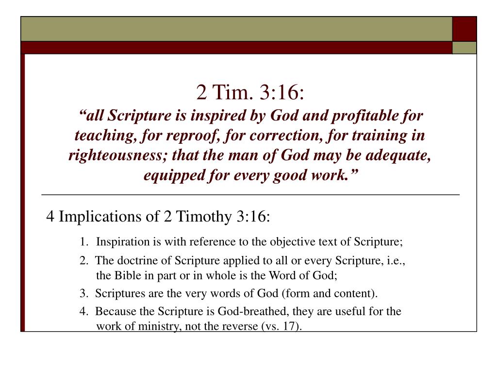 2 Tim. 3:16: “all Scripture is inspired by God and profitable for teaching, for reproof, for correction, for training in righteousness; that the man of God may be adequate, equipped for every good work.” 4 Implications of 2 Timothy 3:16: 1. Inspiration is with reference to the objective text of Scripture; 2. The doctrine of Scripture applied to all or every Scripture, i.e., the Bible in part or in whole is the Word of God; 3. Scriptures are the very words of God (form and content). 4. Because the Scripture is God-breathed, they are useful for the work of ministry, not the reverse (vs. 17).