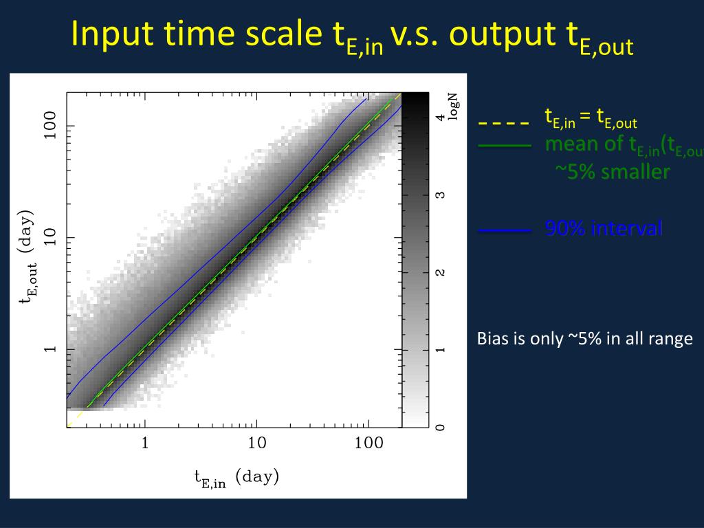 Input time scale tE,inv.s. output tE,out tE,in= tE,out mean of tE,in(tE,out) ~5% smaller 90% interval Bias is only ~5% in all range