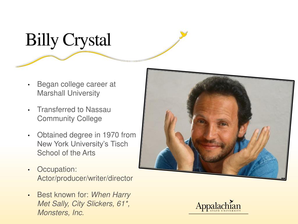 Billy Crystal • Began college career at Marshall University • Transferred to Nassau Community College • Obtained degree in 1970 from New York University’s Tisch School of the Arts • Occupation: Actor/producer/writer/director • Best known for: When Harry Met Sally, City Slickers, 61*, Monsters, Inc.