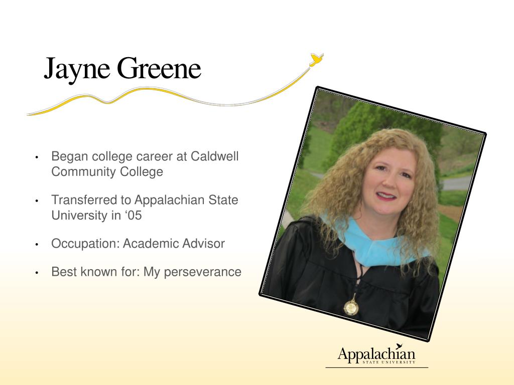 Jayne Greene • Began college career at Caldwell Community College • Transferred to Appalachian State University in ‘05 • Occupation: Academic Advisor • Best known for: My perseverance