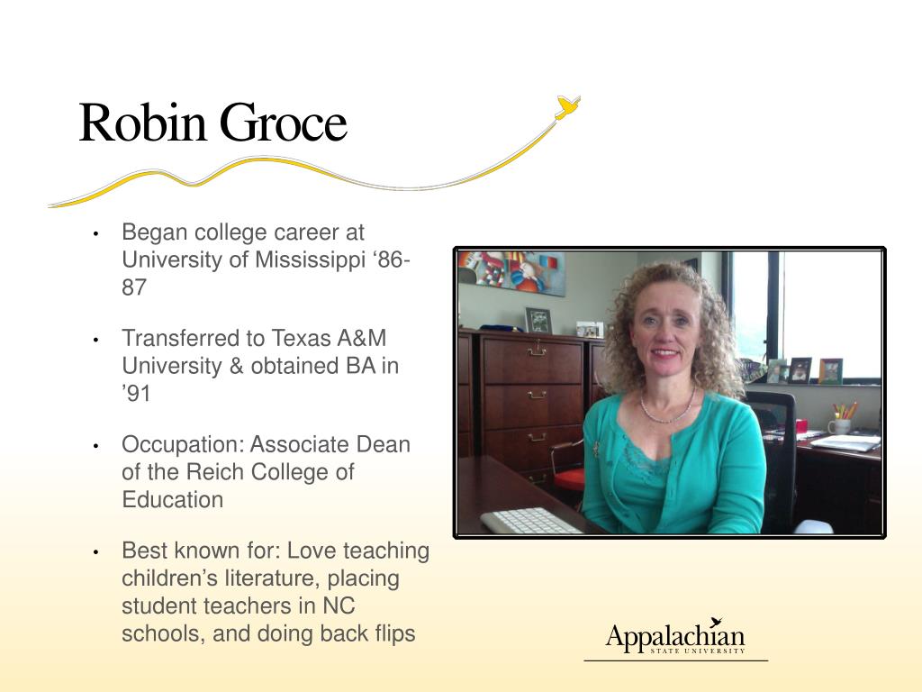 Robin Groce • Began college career at University of Mississippi ‘86-87 • Transferred to Texas A&M University & obtained BA in ’91 • Occupation: Associate Dean of the Reich College of Education • Best known for: Love teaching children’s literature, placing student teachers in NC schools, and doing back flips