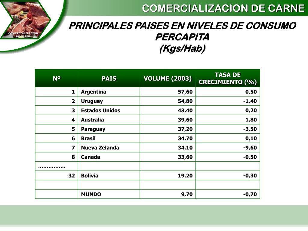 COMERCIALIZACION DE CARNE COMERCIALIZACION DE CARNE PRINCIPALES PAISES EN NIVELES DE CONSUMO PERCAPITA(Kgs/Hab)