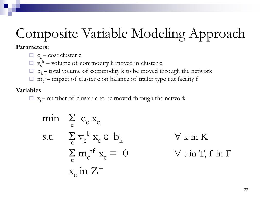 Composite Variable Modeling Approach Parameters: • cc – cost cluster c • vck – volume of commodity k moved in cluster c • bk – total volume of commodity k to be moved through the network • mctf– impact of cluster c on balance of trailer type t at facility f Variables • xc– number of cluster c to be moved through the network min cc xc s.t. vck xc≥ bk k in K mctf xc = 0 t in T, f in F xc in Z+ c c c