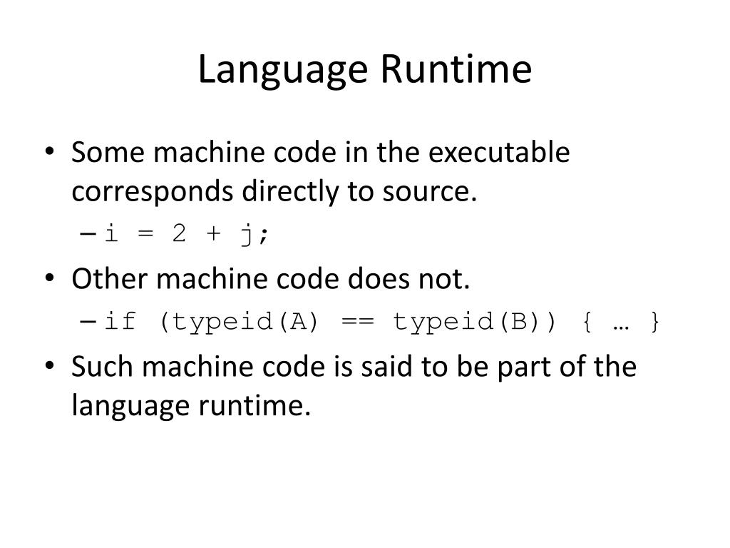 Language Runtime • Some machine code in the executable corresponds directly to source. • i = 2 + j; • Other machine code does not. • if (typeid(A) == typeid(B)) { … } • Such machine code is said to be part of the language runtime.