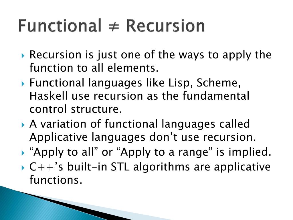 Functional ≠ Recursion • Recursion is just one of the ways to apply the function to all elements. • Functional languages like Lisp, Scheme, Haskell use recursion as the fundamental control structure. • A variation of functional languages called Applicative languages don’t use recursion. • “Apply to all” or “Apply to a range” is implied. • C++’s built-in STL algorithms are applicative functions.
