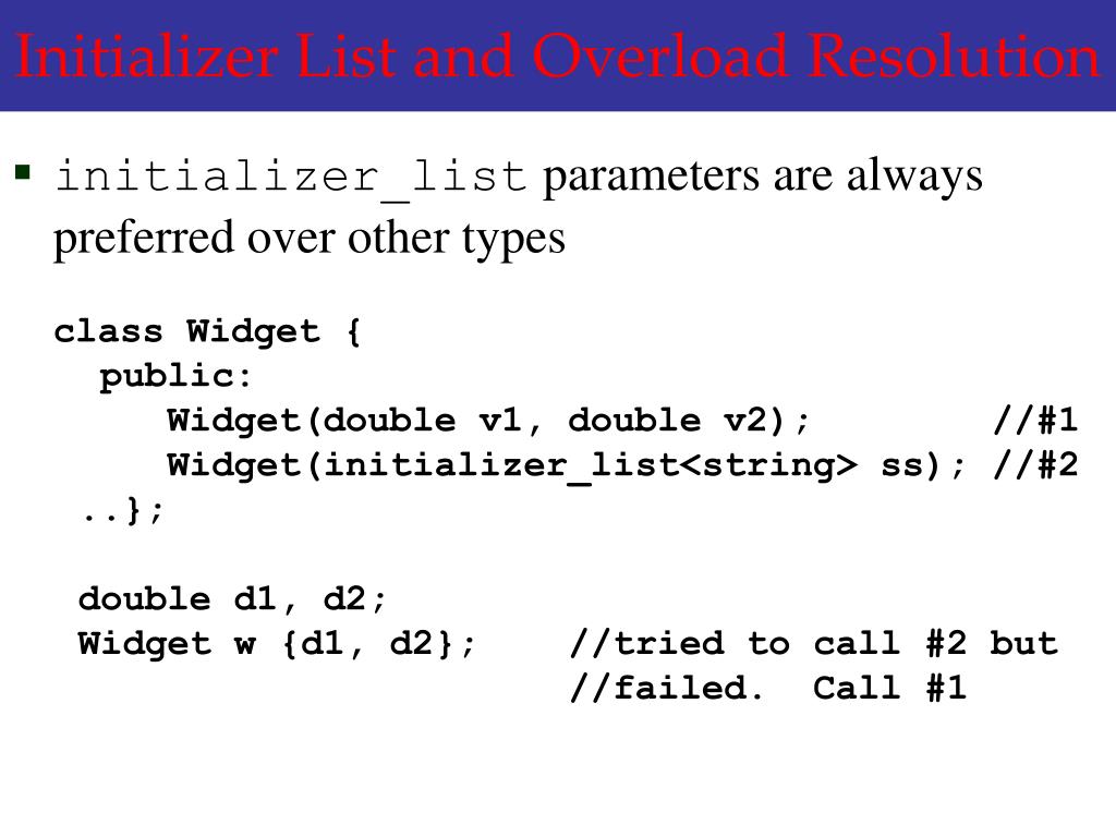 Initializer List and Overload Resolution • When resolving constructor calls, initializer_list parameters are preferred for brace-deliminted arguments: class Widget { public: Widget(double v1, double v2); //#1 Widget(initializer_list<double> vs); //#2 ..}; double d1, d2; Widget w {d1, d2}; //calls #2