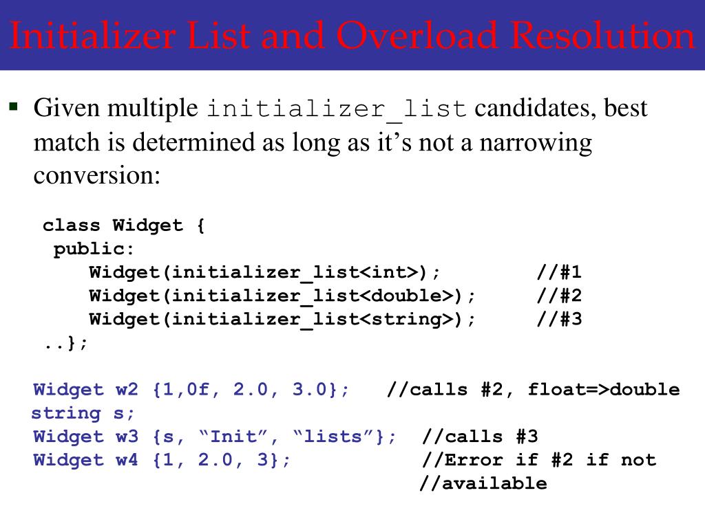Initializer List and Overload Resolution • Given multiple initializer_list candidates, best match is determined as long as it’s not a narrowing conversion: class Widget { public: Widget(initializer_list<int>); //#1 Widget(initializer_list<double>); //#2 Widget(initializer_list<string>); //#3 ..}; Widget w2 {1,0f, 2.0, 3.0}; //calls #2, float=>double string s; Widget w3 {s, “Init”, “lists”}; //calls #3 Widget w4 {1, 2.0, 3}; //Error if #2 if not //available
