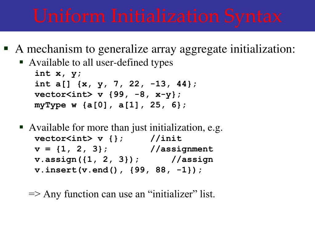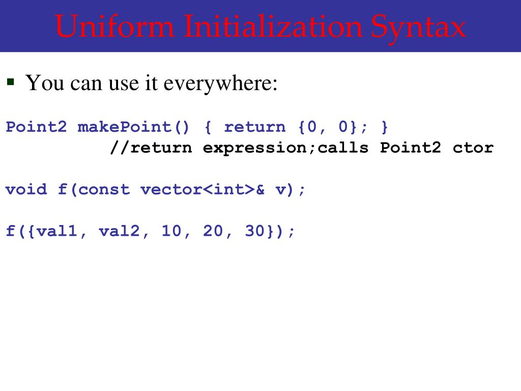 Uniform Initialization Syntax • You can use it everywhere: Point2 makePoint() { return {0, 0}; } //return expression;calls Point2 ctor void f(const vector<int>& v); f({val1, val2, 10, 20, 30});