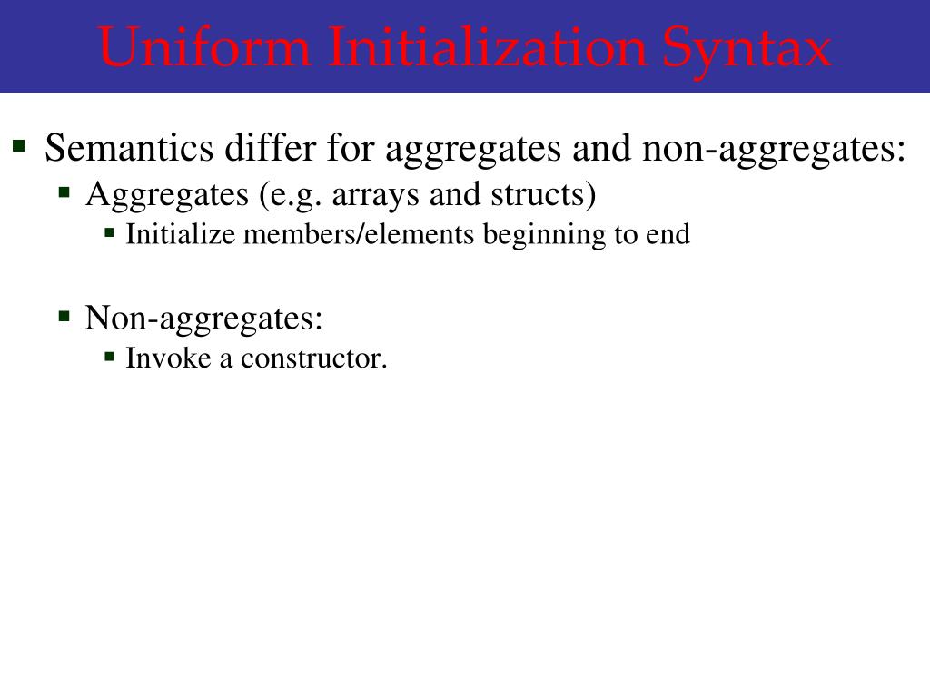 Uniform Initialization Syntax • Semantics differ for aggregates and non-aggregates: • Aggregates (e.g. arrays and structs) • Initialize members/elements beginning to end • Non-aggregates: • Invoke a constructor.