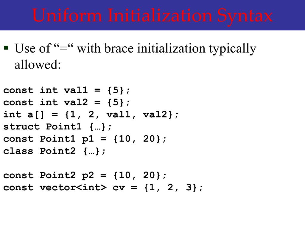 Uniform Initialization Syntax • Use of “=“ with brace initialization typically allowed: const int val1 = {5}; const int val2 = {5}; int a[] = {1, 2, val1, val2}; struct Point1 {…}; const Point1 p1 = {10, 20}; class Point2 {…}; const Point2 p2 = {10, 20}; const vector<int> cv = {1, 2, 3};