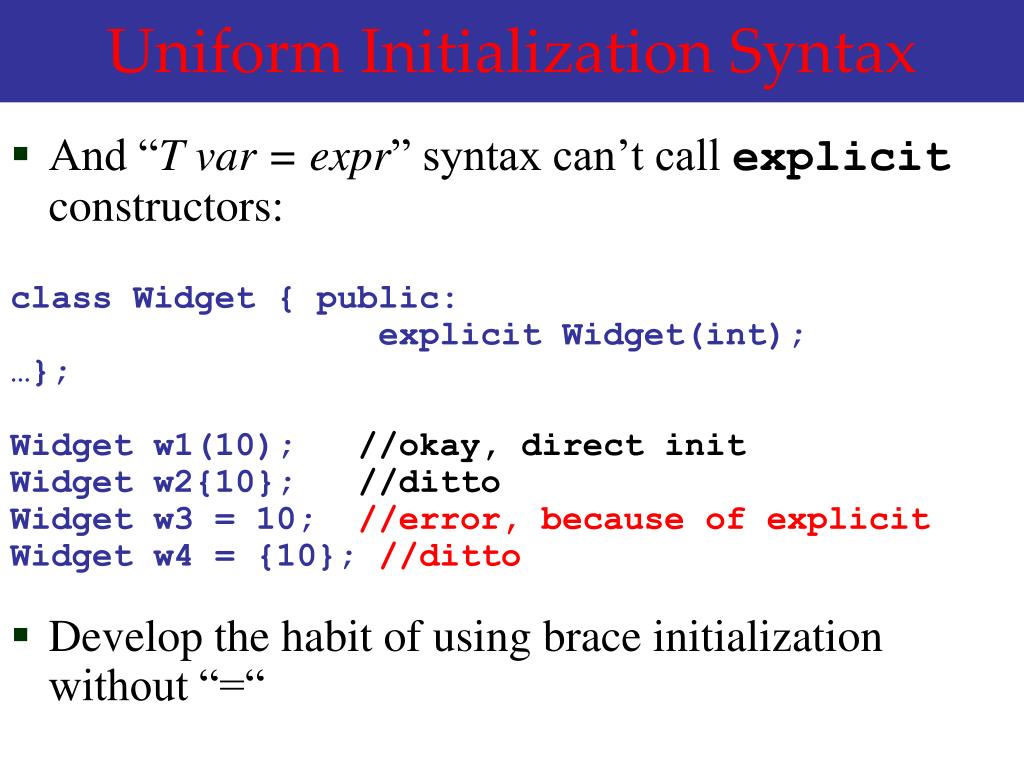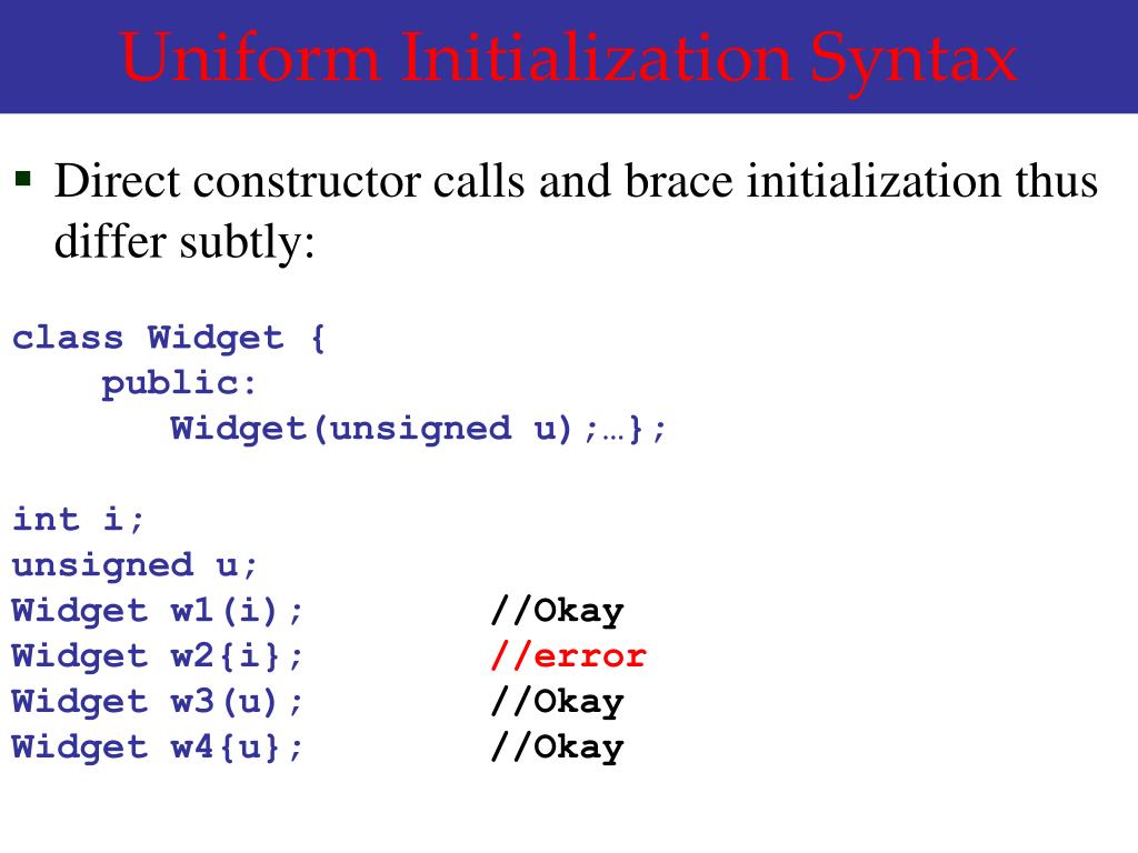 Uniform Initialization Syntax • Direct constructor calls and brace initialization thus differ subtly: class Widget { public: Widget(unsigned u);…}; int i; unsigned u; Widget w1(i); //Okay Widget w2{i}; //error Widget w3(u); //Okay Widget w4{u}; //Okay