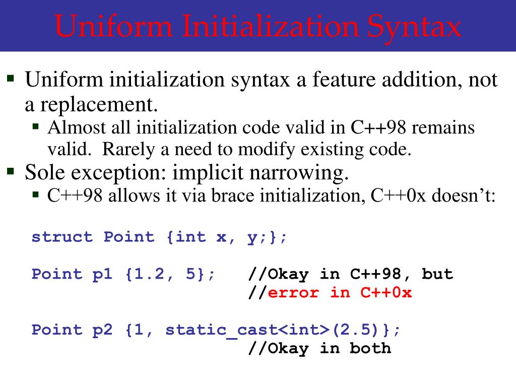 Uniform Initialization Syntax • Uniform initialization syntax a feature addition, not a replacement. • Almost all initialization code valid in C++98 remains valid. Rarely a need to modify existing code. • Sole exception: implicit narrowing. • C++98 allows it via brace initialization, C++0x doesn’t: struct Point {int x, y;}; Point p1 {1.2, 5}; //Okay in C++98, but //error in C++0x Point p2 {1, static_cast<int>(2.5)}; //Okay in both
