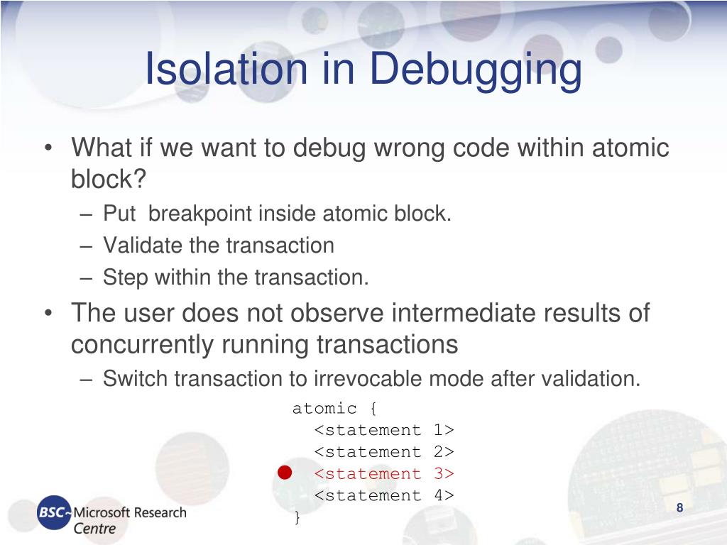 Isolation in Debugging • What if we want to debug wrong code within atomic block? • Put breakpoint inside atomic block. • Validate the transaction • Step within the transaction. • The user does not observe intermediate results of concurrently running transactions • Switch transaction to irrevocable mode after validation. atomic { <statement 1> <statement 2> <statement 3> <statement 4> }