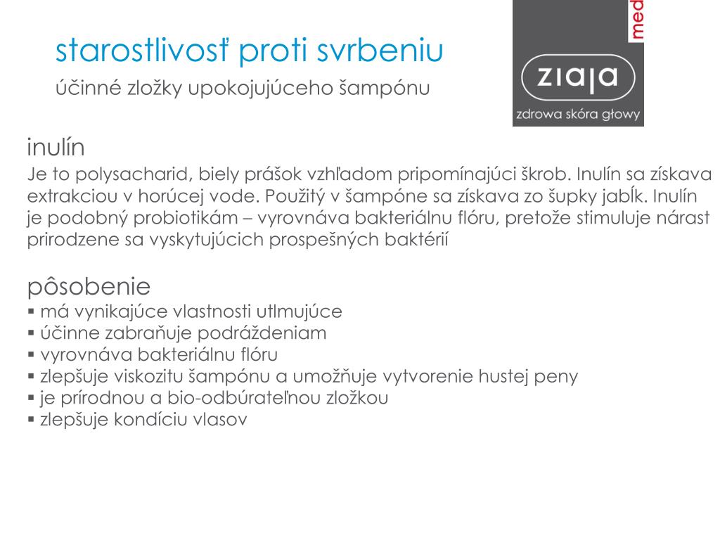starostlivosť proti svrbeniu účinné zložky upokojujúceho šampónu • inulín • Je to polysacharid, biely prášok vzhľadom pripomínajúci škrob. Inulín sa získava extrakciou v horúcej vode. Použitý v šampóne sa získava zo šupky jabĺk. Inulín je podobný probiotikám – vyrovnáva bakteriálnu flóru, pretože stimuluje nárast prirodzene sa vyskytujúcich prospešných baktérií • pôsobenie • má vynikajúce vlastnosti utlmujúce • účinne zabraňuje podráždeniam • vyrovnáva bakteriálnu flóru • zlepšuje viskozitu šampónu a umožňuje vytvorenie hustej peny • je prírodnou a bio-odbúrateľnou zložkou • zlepšuje kondíciu vlasov