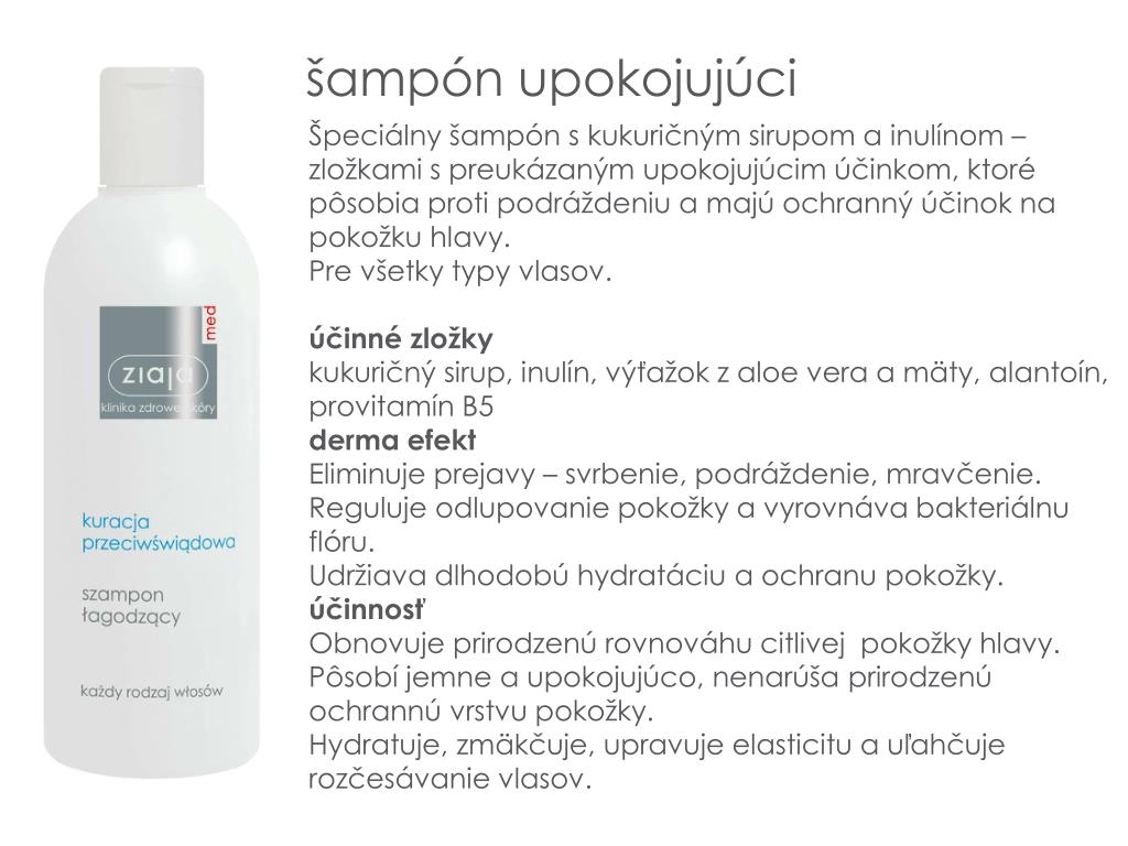 šampón upokojujúci Špeciálny šampón s kukuričným sirupom a inulínom – zložkami s preukázaným upokojujúcim účinkom, ktoré pôsobia proti podráždeniu a majú ochranný účinok na pokožku hlavy. Pre všetky typy vlasov. účinné zložky kukuričný sirup, inulín, výťažok z aloe vera a mäty, alantoín, provitamín B5 derma efekt Eliminuje prejavy – svrbenie, podráždenie, mravčenie. Reguluje odlupovanie pokožky a vyrovnáva bakteriálnu flóru. Udržiava dlhodobú hydratáciu a ochranu pokožky. účinnosť Obnovuje prirodzenú rovnováhu citlivej pokožky hlavy. Pôsobí jemne a upokojujúco, nenarúša prirodzenú ochrannú vrstvu pokožky. Hydratuje, zmäkčuje, upravuje elasticitu a uľahčuje rozčesávanie vlasov.