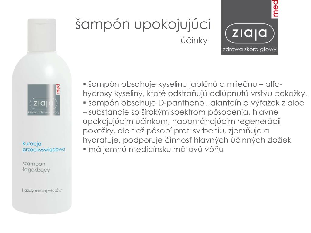 šampón upokojujúci účinky • šampón obsahuje kyselinu jablčnú a mliečnu – alfa-hydroxy kyseliny, ktoré odstraňujú odlúpnutú vrstvu pokožky. • šampón obsahuje D-panthenol, alantoín a výťažok z aloe – substancie so širokým spektrom pôsobenia, hlavne upokojujúcim účinkom, napomáhajúcim regenerácii pokožky, ale tiež pôsobí proti svrbeniu, zjemňuje a hydratuje, podporuje činnosť hlavných účinných zložiek • má jemnú medicínsku mätovú vôňu
