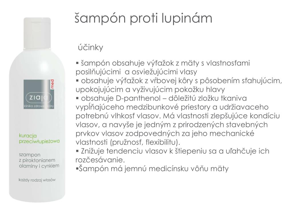 šampón proti lupinám účinky • šampón obsahuje výťažok z mäty s vlastnosťami posilňujúcimi a osviežujúcimi vlasy • obsahuje výťažok z vŕbovej kôry s pôsobením sťahujúcim, upokojujúcim a vyživujúcim pokožku hlavy • obsahuje D-panthenol – dôležitú zložku tkaniva vypĺňajúceho medzibunkové priestory a udržiavaceho potrebnú vlhkosť vlasov. Má vlastnosti zlepšujúce kondíciu vlasov, a navyše je jedným z prirodzených stavebných prvkov vlasov zodpovedných za jeho mechanické vlastnosti (pružnosť, flexibilitu). • Znižuje tendenciu vlasov k štiepeniu sa a uľahčuje ich rozčesávanie. • Šampón má jemnú medicínsku vôňu mäty