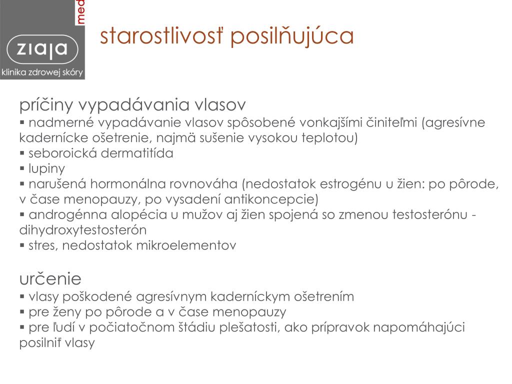 starostlivosť posilňujúca • príčiny vypadávania vlasov • nadmerné vypadávanie vlasov spôsobené vonkajšími činiteľmi (agresívne kadernícke ošetrenie, najmä sušenie vysokou teplotou) • seboroická dermatitída • lupiny • narušená hormonálna rovnováha (nedostatok estrogénu u žien: po pôrode, v čase menopauzy, po vysadení antikoncepcie) • androgénna alopécia u mužov aj žien spojená so zmenou testosterónu - dihydroxytestosterón • stres, nedostatok mikroelementov • určenie • vlasy poškodené agresívnym kaderníckym ošetrením • pre ženy po pôrode a v čase menopauzy • pre ľudí v počiatočnom štádiu plešatosti, ako prípravok napomáhajúci posilniť vlasy