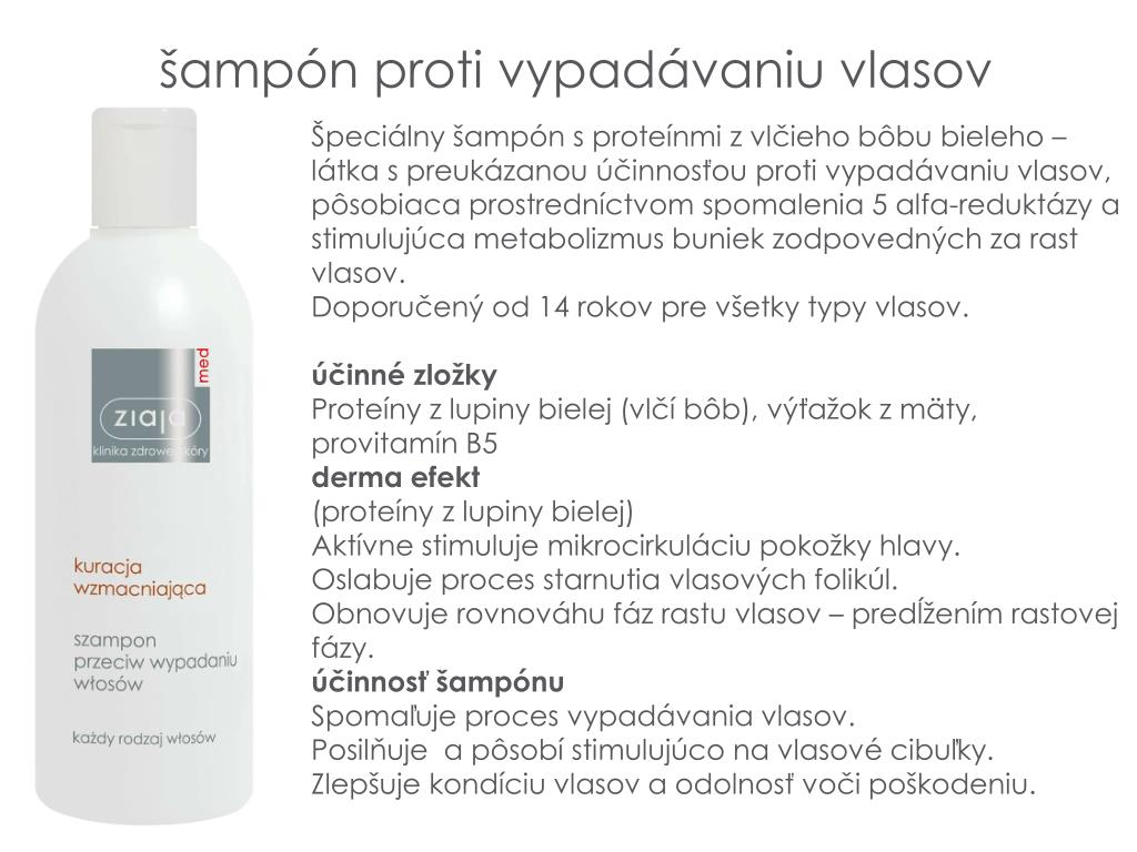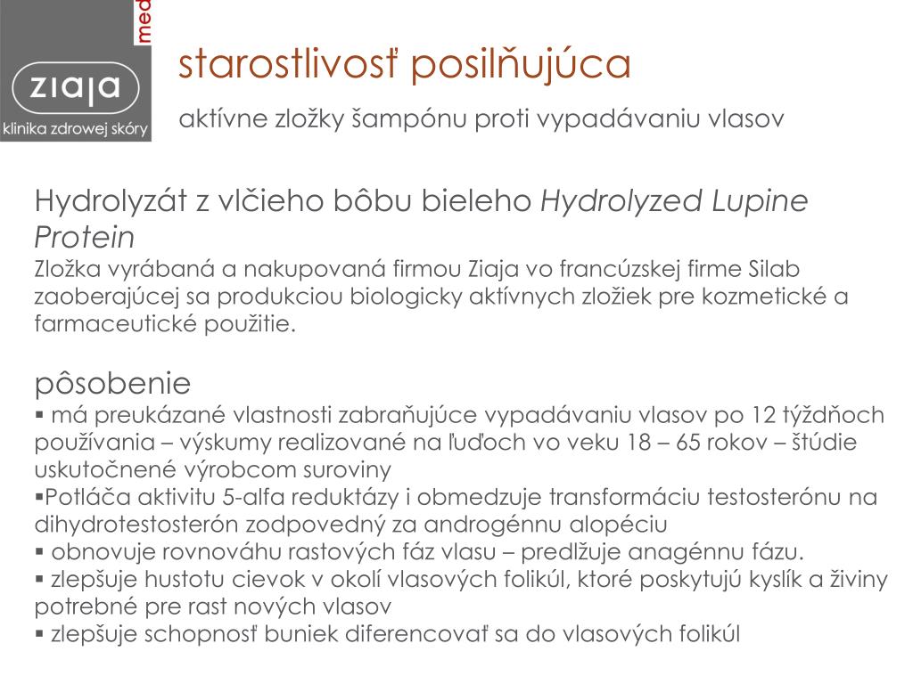 starostlivosť posilňujúca aktívne zložky šampónu proti vypadávaniu vlasov • Hydrolyzát z vlčieho bôbu bieleho Hydrolyzed Lupine Protein • Zložka vyrábaná a nakupovaná firmou Ziaja vo francúzskej firme Silab zaoberajúcej sa produkciou biologicky aktívnych zložiek pre kozmetické a farmaceutické použitie. • pôsobenie • má preukázané vlastnosti zabraňujúce vypadávaniu vlasov po 12 týždňoch používania – výskumy realizované na ľuďoch vo veku 18 – 65 rokov – štúdie uskutočnené výrobcom suroviny • Potláča aktivitu 5-alfa reduktázy i obmedzuje transformáciu testosterónu na dihydrotestosterón zodpovedný za androgénnu alopéciu • obnovuje rovnováhu rastových fáz vlasu – predlžuje anagénnu fázu. • zlepšuje hustotu cievok v okolí vlasových folikúl, ktoré poskytujú kyslík a živiny potrebné pre rast nových vlasov • zlepšuje schopnosť buniek diferencovať sa do vlasových folikúl