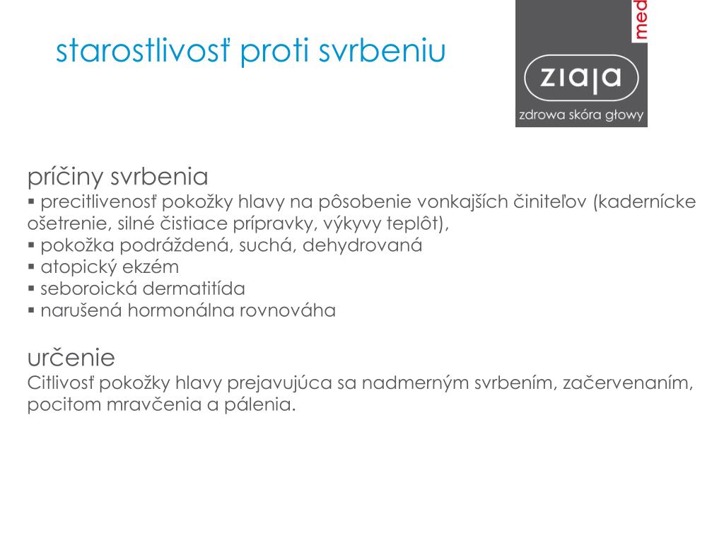 starostlivosť proti svrbeniu • príčiny svrbenia • precitlivenosť pokožky hlavy na pôsobenie vonkajších činiteľov (kadernícke ošetrenie, silné čistiace prípravky, výkyvy teplôt), • pokožka podráždená, suchá, dehydrovaná • atopický ekzém • seboroická dermatitída • narušená hormonálna rovnováha • určenie • Citlivosť pokožky hlavy prejavujúca sa nadmerným svrbením, začervenaním, pocitom mravčenia a pálenia.