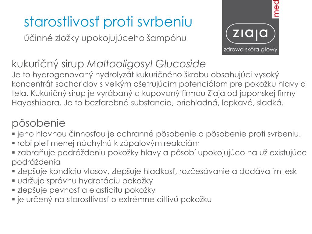 starostlivosť proti svrbeniu účinné zložky upokojujúceho šampónu • kukuričný sirup Maltooligosyl Glucoside • Je to hydrogenovaný hydrolyzát kukuričného škrobu obsahujúci vysoký koncentrát sacharidov s veľkým ošetrujúcim potenciálom pre pokožku hlavy a tela. Kukuričný sirup je vyrábaný a kupovaný firmou Ziaja od japonskej firmy Hayashibara. Je to bezfarebná substancia, priehľadná, lepkavá, sladká. • pôsobenie • jeho hlavnou činnosťou je ochranné pôsobenie a pôsobenie proti svrbeniu. • robí pleť menej náchylnú k zápalovým reakciám • zabraňuje podráždeniu pokožky hlavy a pôsobí upokojujúco na už existujúce podráždenia • zlepšuje kondíciu vlasov, zlepšuje hladkosť, rozčesávanie a dodáva im lesk • udržuje správnu hydratáciu pokožky • zlepšuje pevnosť a elasticitu pokožky • je určený na starostlivosť o extrémne citlivú pokožku