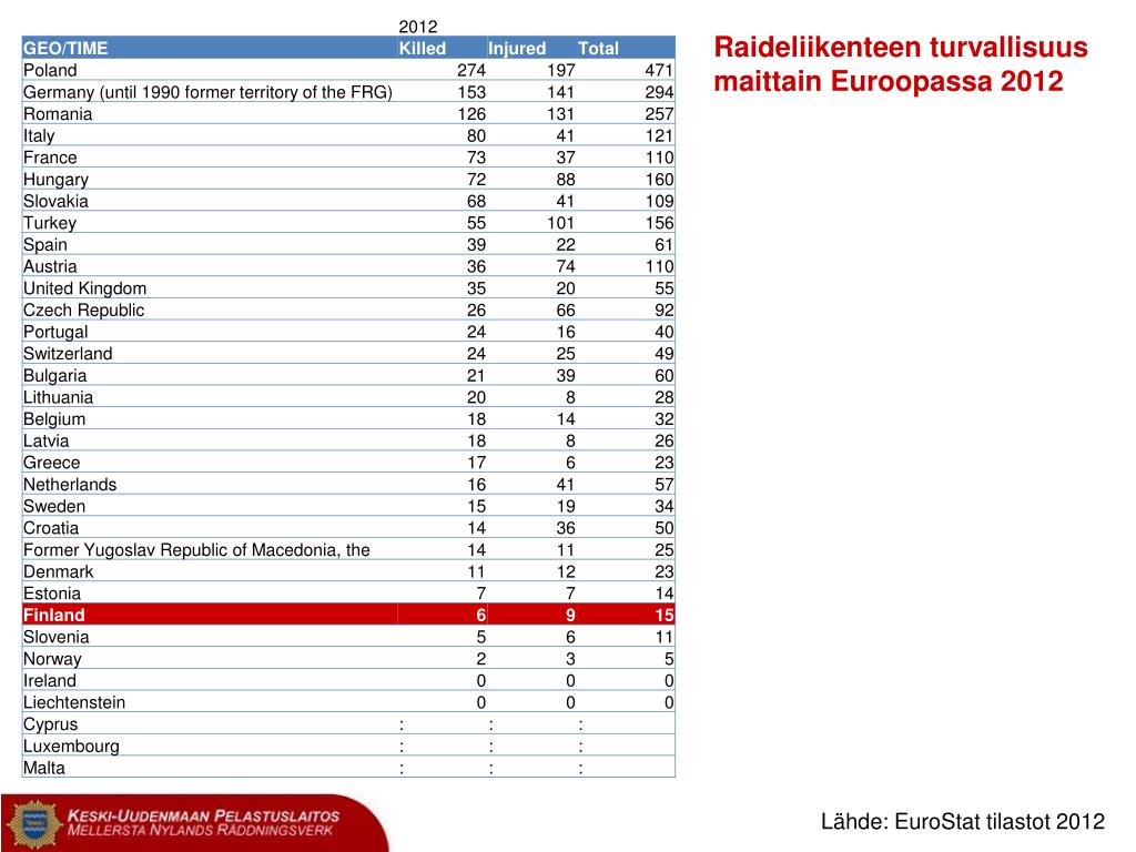 Raideliikenteen turvallisuus maittain Euroopassa 2012 Lähde: EuroStat tilastot 2012
