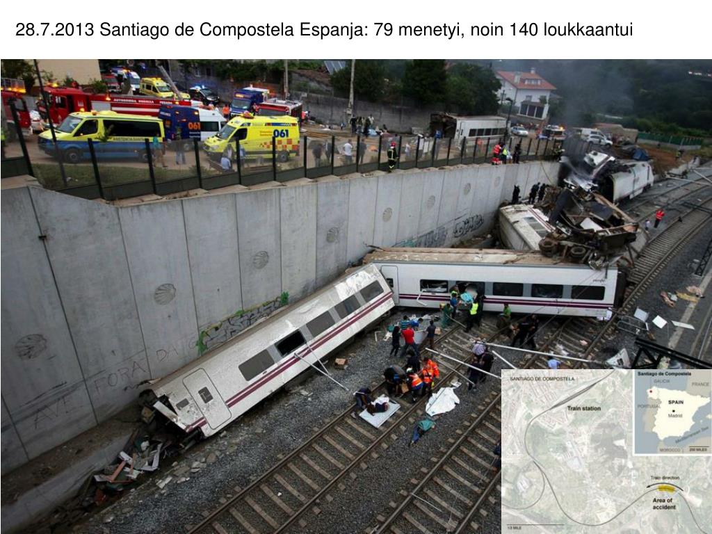 2000-luvun pahimpia junaturmia Euroopassa • 2013 heinäkuu: Juna suistuu kovassa ylinopeudessa kiskoilta Santiago de Compostelan lähellä Espanjassa. Ainakin 77 kuolee ja yli 140 loukkaantuu. • 2013 heinäkuu: Ranskassa Brétigny-sur-Orgen asemalla matkustajajuna suistuu raiteilta. Kuusi kuolee ja 30 loukkaantuu. • 2012 maaliskuu: Kaksi matkustajajunaa törmää Szczekocinyn pikkukaupungissa Krakovan ja Varsovan välisellä rataosuudella.16 ihmistä kuolee ja 56 loukkaantuu. • 2010 helmikuu: Kaksi junaa törmää lumisateessa lähellä Hallen kaupunkia Brysselin lounaispuolella. 18 ihmistä kuolee. • 2009 kesäkuu: Yöllä rahtijunassa tapahtunut räjähdys sytyttää radan varressa olevia taloja palamaan Viareggion rantakaupungissa Italiassa. Noin 22 ihmistä kuolee tulipalossa. • 2006 syyskuu: Luotijuna törmää huoltoajoneuvoon testiradalla Emslandin piirikunnassa Pohjois-Saksassa. 23 ihmistä saa surmansa. • 2006 elokuu: Intercity-juna suistuu kiskoilta VilladassaPalencian maakunnassa Espanjassa. Kuusiihmistä saa surmansa ja kymmeniä loukkaantuu. • 2006 heinäkuu: Ainakin 41 henkilöä saa surmansa junan suistuessa kiskoilta ja kääntyessä ympäri metrotunnelissa Valencian kaupungissa Espanjassa. • 2006 tammikuu: Tupaten täysi juna suistuu kiskoilta ja syöksyy rotkoon pääkaupunki Podgorican ulkopuolella Montenegrossa. 46 kuolee ja 198 loukkaantuu. • 2003 toukokuu: Juna törmää tasoristeyksessä saksalaiseen turistibussiin lähellä Siofokin kaupunkia Unkarissa. 34 henkilöä saa surmansa. • 2003 kesäkuu: Vähintään 19 ihmistä kuolee ja noin 40 loukkantuu junien törmäyksessä lähellä Chinchillan kaupunkia Albaceten maakunnassa Espanjassa. • 2000 marraskuu: Hiihtoturisteja kuljettanut juna syttyy palamaan tunnelissa Itävallassa. 155 ihmistä kuolee.