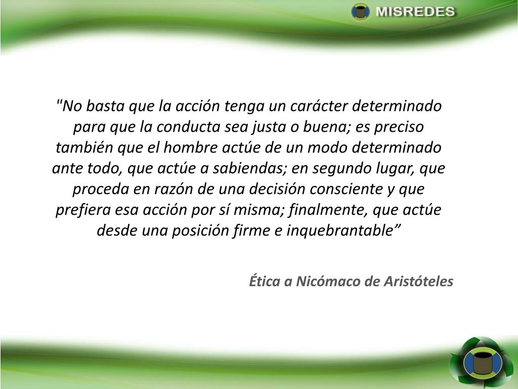 "No basta que la acción tenga un carácter determinado para que la conducta sea justa o buena; es preciso también que el hombre actúe de un modo determinado ante todo, que actúe a sabiendas; en segundo lugar, que proceda en razón de una decisión consciente y que prefiera esa acción por sí misma; finalmente, que actúe desde una posición firme e inquebrantable” Ética a Nicómaco de Aristóteles