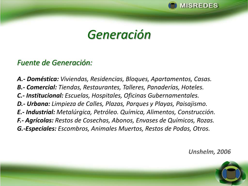 Generación Fuente de Generación: A.- Doméstica: Viviendas, Residencias, Bloques, Apartamentos, Casas. B.- Comercial: Tiendas, Restaurantes, Talleres, Panaderías, Hoteles. C.- Institucional: Escuelas, Hospitales, Oficinas Gubernamentales. D.- Urbana: Limpieza de Calles, Plazas, Parques y Playas, Paisajismo. E.- Industrial: Metalúrgica, Petróleo. Química, Alimentos, Construcción. F.- Agrícolas: Restos de Cosechas, Abonos, Envases de Químicos, Rozas. G.-Especiales: Escombros, Animales Muertos, Restos de Podas, Otros. Unshelm, 2006
