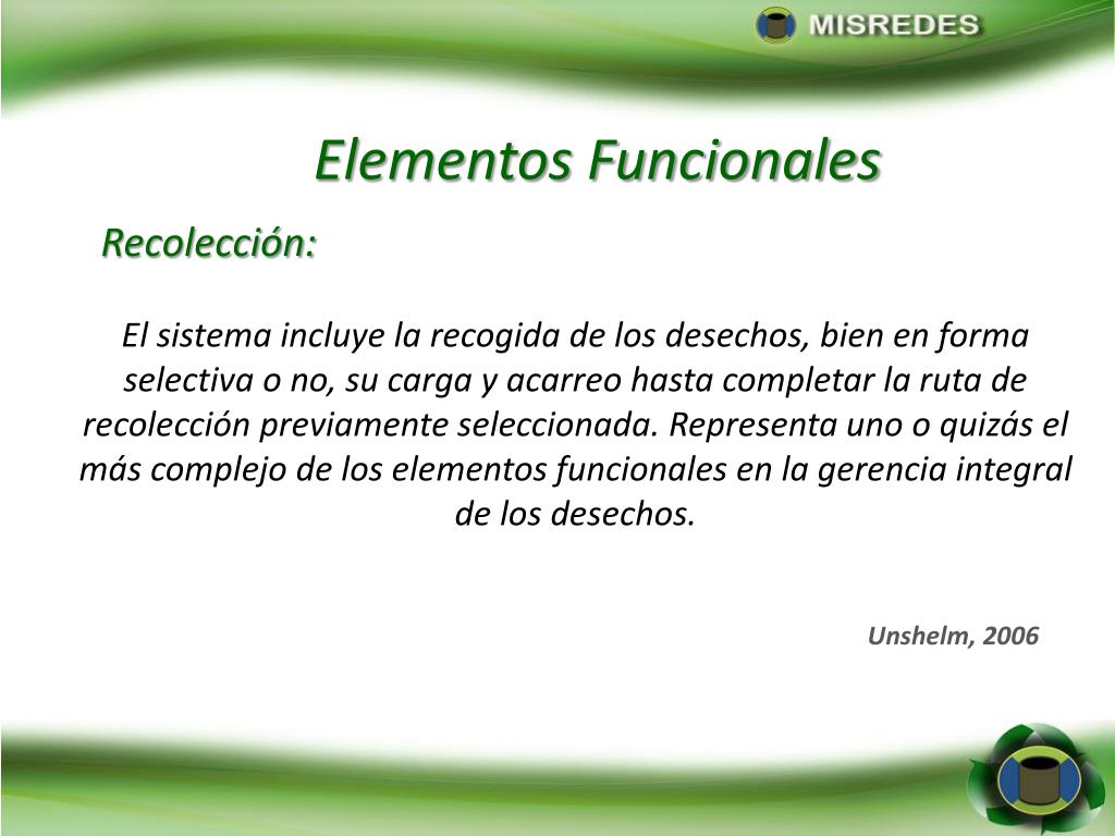 Elementos Funcionales Recolección: El sistema incluye la recogida de los desechos, bien en forma selectiva o no, su carga y acarreo hasta completar la ruta de recolección previamente seleccionada. Representa uno o quizás el más complejo de los elementos funcionales en la gerencia integral de los desechos. Unshelm, 2006