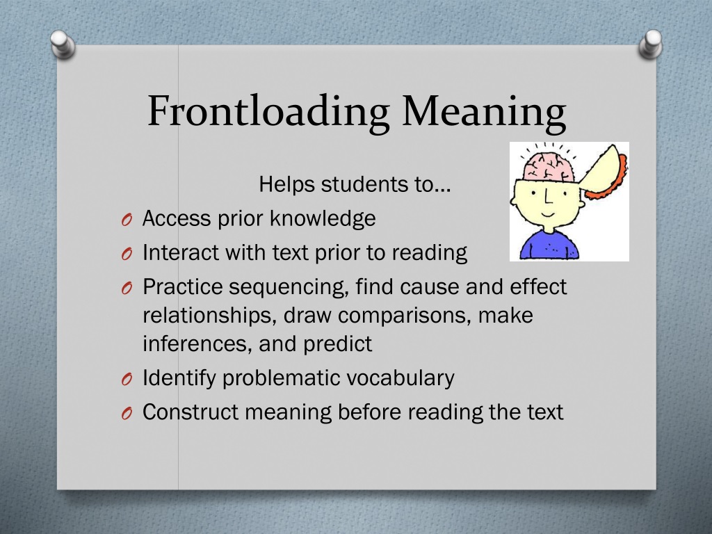 Frontloading Meaning Helps students to… • Access prior knowledge • Interact with text prior to reading • Practice sequencing, find cause and effect relationships, draw comparisons, make inferences, and predict • Identify problematic vocabulary • Construct meaning before reading the text