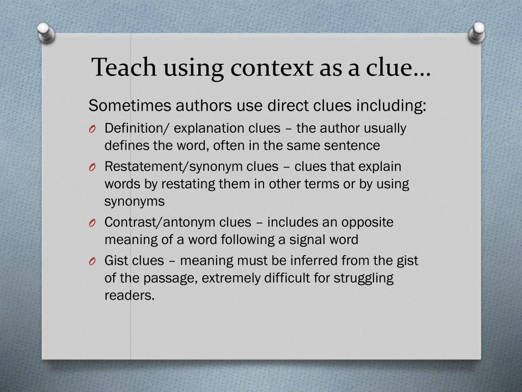 Teach using context as a clue… Sometimes authors use direct clues including: • Definition/ explanation clues – the author usually defines the word, often in the same sentence • Restatement/synonym clues – clues that explain words by restating them in other terms or by using synonyms • Contrast/antonym clues – includes an opposite meaning of a word following a signal word • Gist clues – meaning must be inferred from the gist of the passage, extremely difficult for struggling readers.