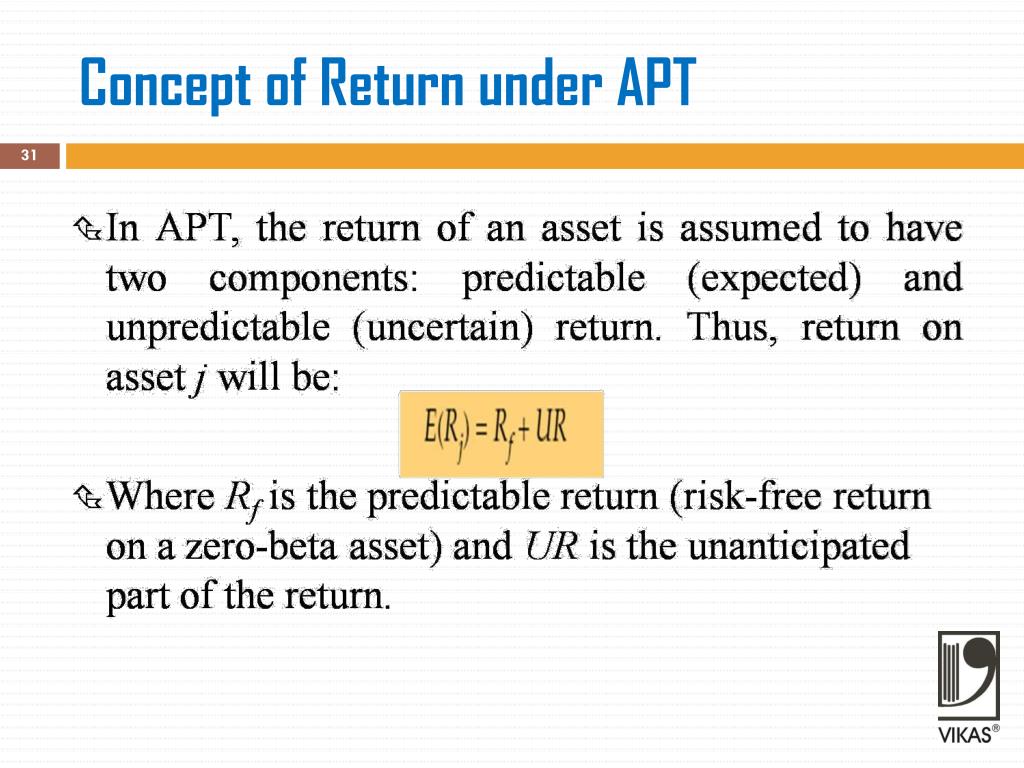 THE ARBITRAGE PRICING THEORY (APT) • The act of taking advantage of a price differential between two or more markets is referred to as arbitrage. • The Arbitrage Pricing Theory (APT) describes the method of bring a mispriced asset in line with its expected price. • An asset is considered mispriced if its current price is different from the predicted price as per the model. • The fundamental logic of APT is that investors always indulge in arbitrage whenever they find differences in the returns of assets with similar risk characteristics.