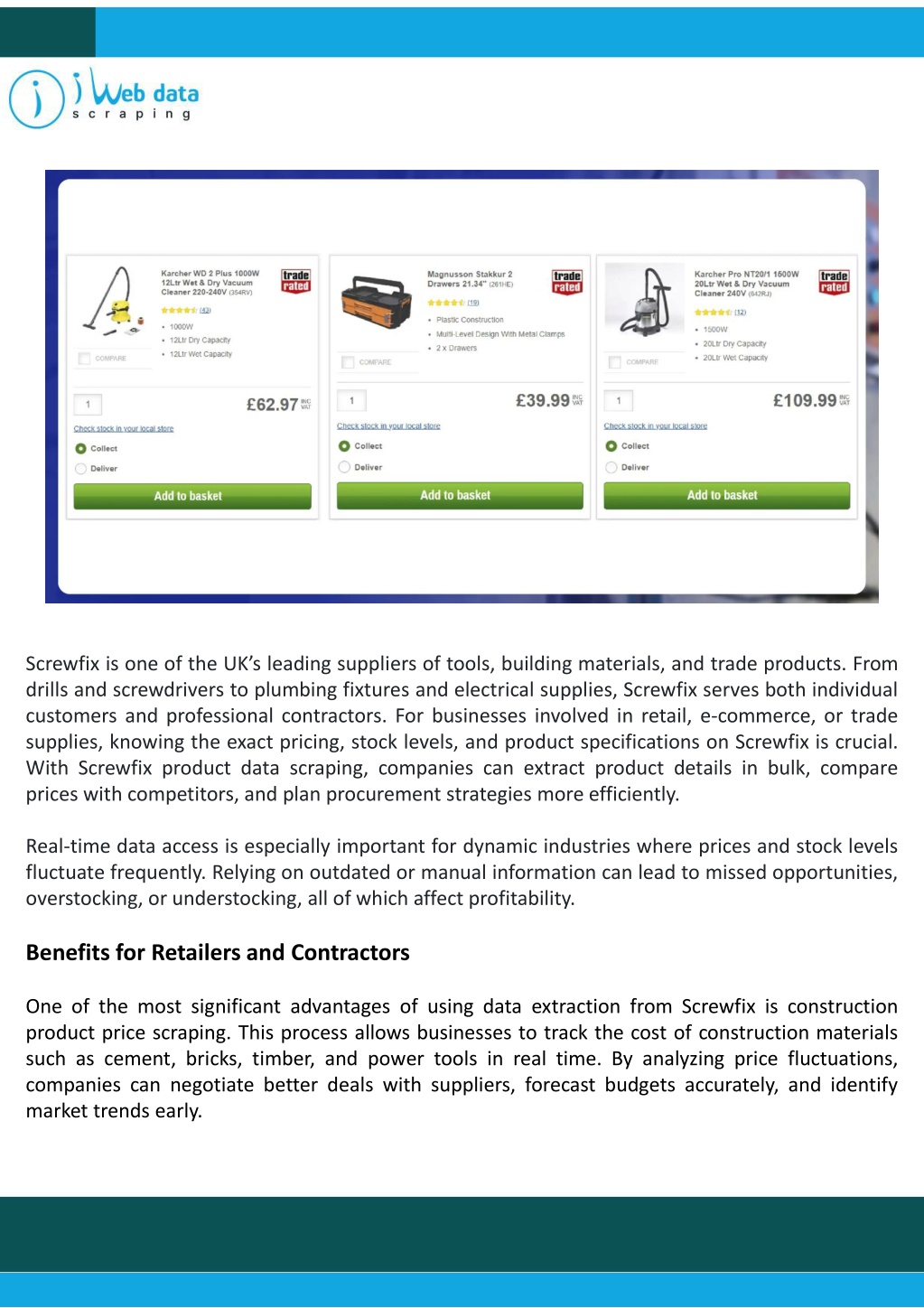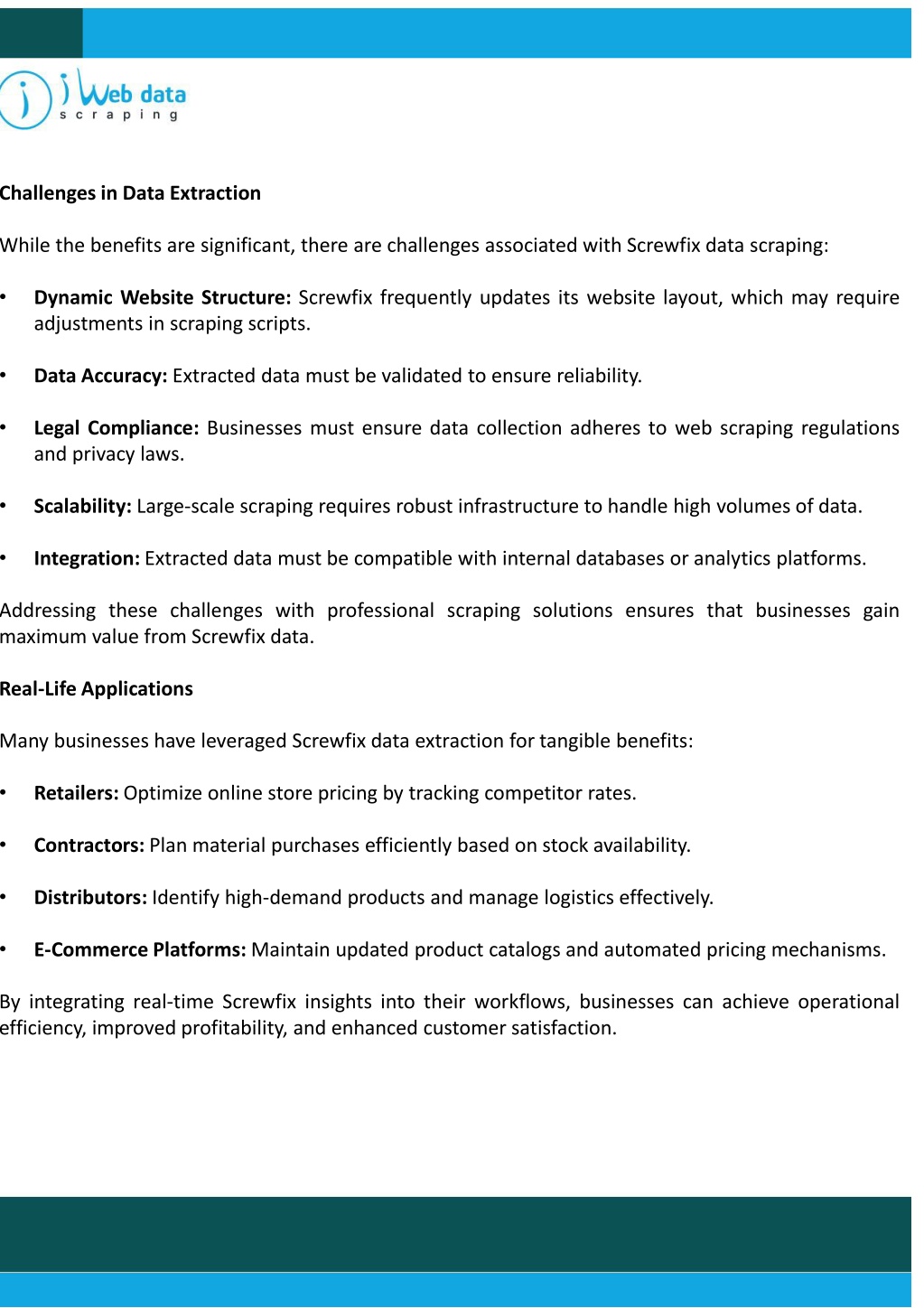 Challenges in Data Extraction While the benefits are significant, there are challenges associated with Screwfix data scraping: • Dynamic Website Structure: Screwfix frequently updates its website layout, which may require adjustments in scraping scripts. • Data Accuracy: Extracted data must be validated to ensure reliability. • Legal Compliance: Businesses must ensure data collection adheres to web scraping regulations and privacy laws. • Scalability: Large-scale scraping requires robust infrastructure to handle high volumes of data. • Integration: Extracted data must be compatible with internal databases or analytics platforms. Addressing these challenges with professional scraping solutions ensures that businesses gain maximum value from Screwfix data. Real-Life Applications Many businesses have leveraged Screwfix data extraction for tangible benefits: • Retailers:Optimize online store pricing by tracking competitor rates. • Contractors: Plan material purchases efficiently based on stock availability. • Distributors: Identify high-demand products and manage logistics effectively. • E-Commerce Platforms: Maintain updated product catalogs and automated pricing mechanisms. By integrating real-time Screwfix insights into their workflows, businesses can achieve operational efficiency, improved profitability, and enhanced customer satisfaction.