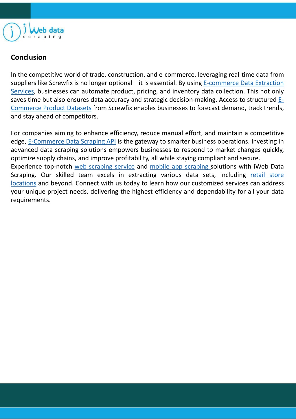 Conclusion In the competitive world of trade, construction, and e-commerce, leveraging real-time data from suppliers like Screwfix is no longer optional—it is essential. By using E-commerce Data Extraction Services, businesses can automate product, pricing, and inventory data collection. This not only saves time but also ensures data accuracy and strategic decision-making. Access to structured E- Commerce Product Datasets from Screwfix enables businesses to forecast demand, track trends, and stay ahead of competitors. For companies aiming to enhance efficiency, reduce manual effort, and maintain a competitive edge, E-Commerce Data Scraping API is the gateway to smarter business operations. Investing in advanced data scraping solutions empowers businesses to respond to market changes quickly, optimize supply chains, and improve profitability, all while staying compliant and secure. Experience top-notch web scraping service and mobile app scraping solutions with iWeb Data Scraping. Our skilled team excels in extracting various data sets, including retail store locations and beyond. Connect with us today to learn how our customized services can address your unique project needs, delivering the highest efficiency and dependability for all your data requirements.