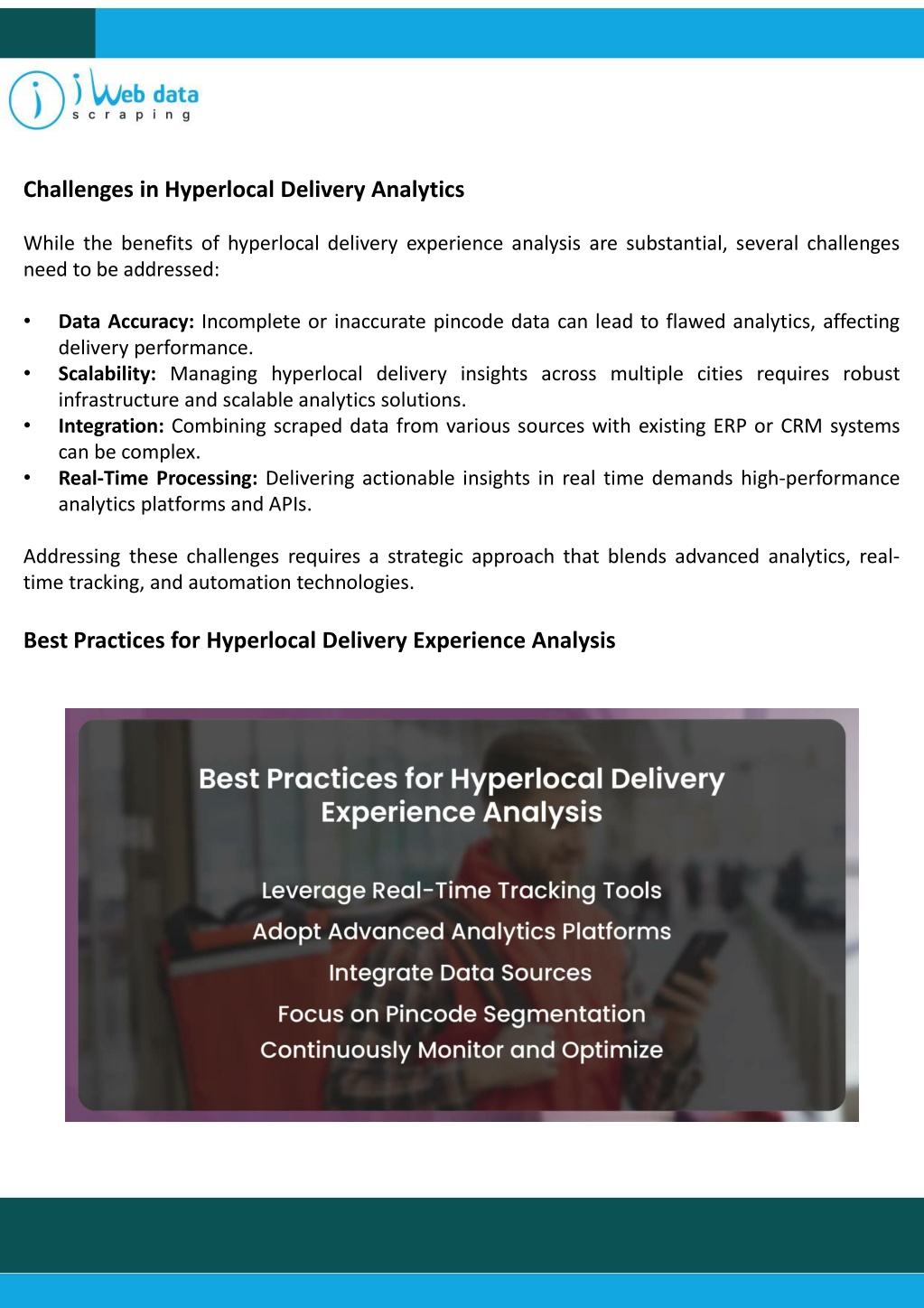 Challenges in Hyperlocal Delivery Analytics • While the benefits of hyperlocal delivery experience analysis are substantial, several challenges need to be addressed: • Data Accuracy: Incomplete or inaccurate pincode data can lead to flawed analytics, affecting delivery performance. • Scalability: Managing hyperlocal delivery insights across multiple cities requires robust infrastructure and scalable analytics solutions. • Integration: Combining scraped data from various sources with existing ERP or CRM systems can be complex. • Real-Time Processing: Delivering actionable insights in real time demands high-performance analytics platforms and APIs. • Addressing these challenges requires a strategic approach that blends advanced analytics, real-time tracking, and automation technologies. • Best Practices for Hyperlocal Delivery Experience Analysis