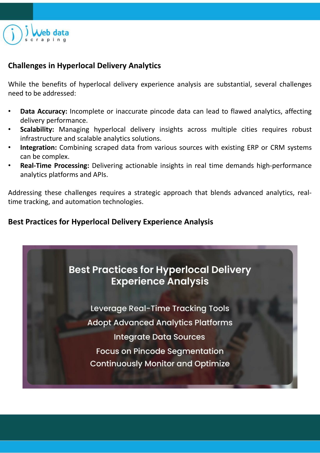 Challenges in Hyperlocal Delivery Analytics While the benefits of hyperlocal delivery experience analysis are substantial, several challenges need to be addressed: • Data Accuracy: Incomplete or inaccurate pincode data can lead to flawed analytics, affecting delivery performance. Scalability: Managing hyperlocal delivery insights across multiple cities requires robust infrastructure and scalable analytics solutions. Integration: Combining scraped data from various sources with existing ERP or CRM systems can be complex. Real-Time Processing: Delivering actionable insights in real time demands high-performance analytics platforms and APIs. • • • Addressing these challenges requires a strategic approach that blends advanced analytics, real- time tracking, and automation technologies. Best Practices for Hyperlocal Delivery Experience Analysis