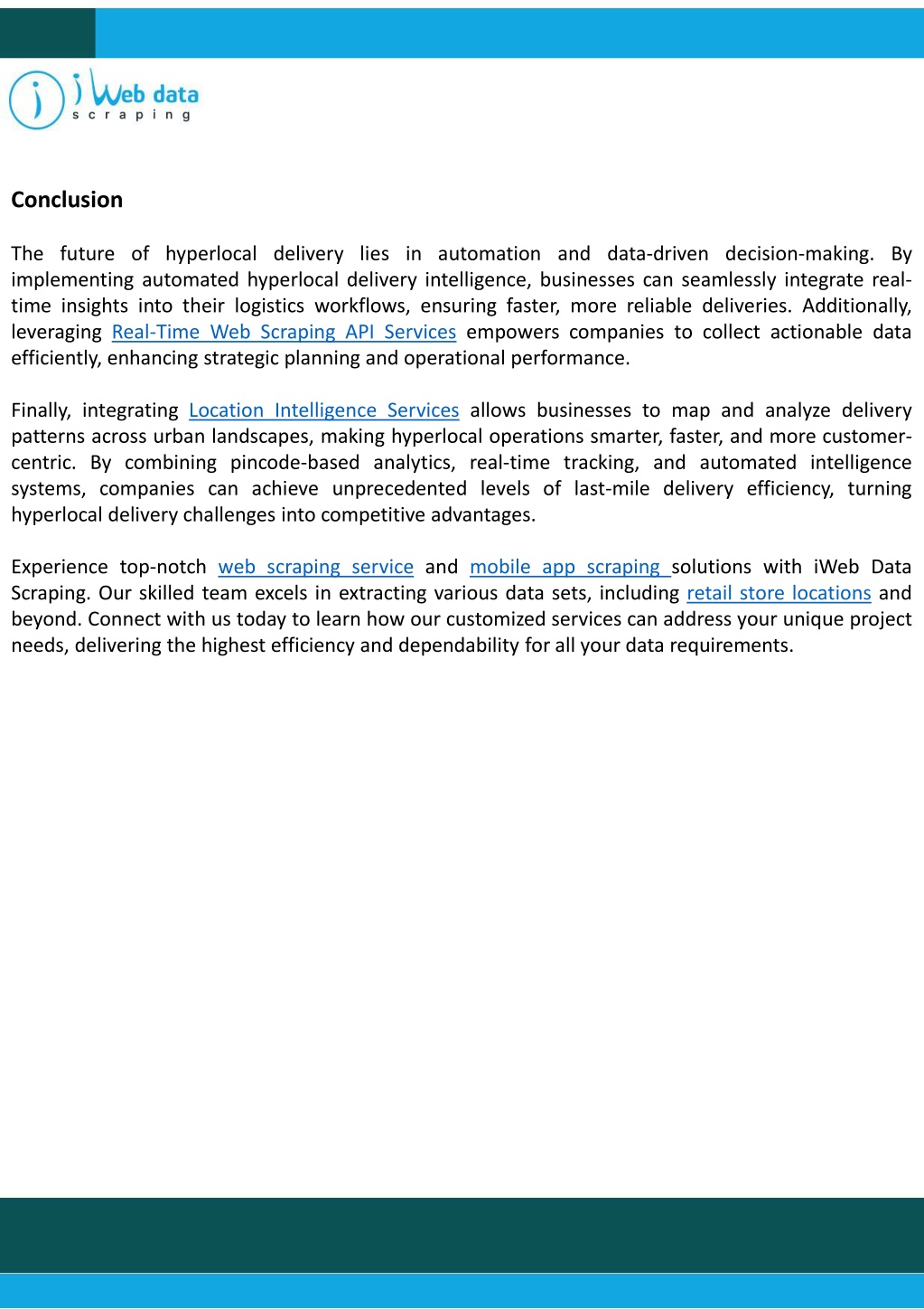 Conclusion The future of hyperlocal delivery lies in automation and data-driven decision-making. By implementing automated hyperlocal delivery intelligence, businesses can seamlessly integrate real- time insights into their logistics workflows, ensuring faster, more reliable deliveries. Additionally, leveraging Real-Time Web Scraping API Services empowers companies to collect actionable data efficiently, enhancing strategic planning and operational performance. Finally, integrating Location Intelligence Services allows businesses to map and analyze delivery patterns across urban landscapes, making hyperlocal operations smarter, faster, and more customer- centric. By combining pincode-based analytics, real-time tracking, and automated intelligence systems, companies can achieve unprecedented levels of last-mile delivery efficiency, turning hyperlocal delivery challenges into competitive advantages. Experience top-notch web scraping service and mobile app scraping solutions with iWeb Data Scraping. Our skilled team excels in extracting various data sets, including retail store locations and beyond. Connect with us today to learn how our customized services can address your unique project needs, delivering the highest efficiency and dependability for all your data requirements.