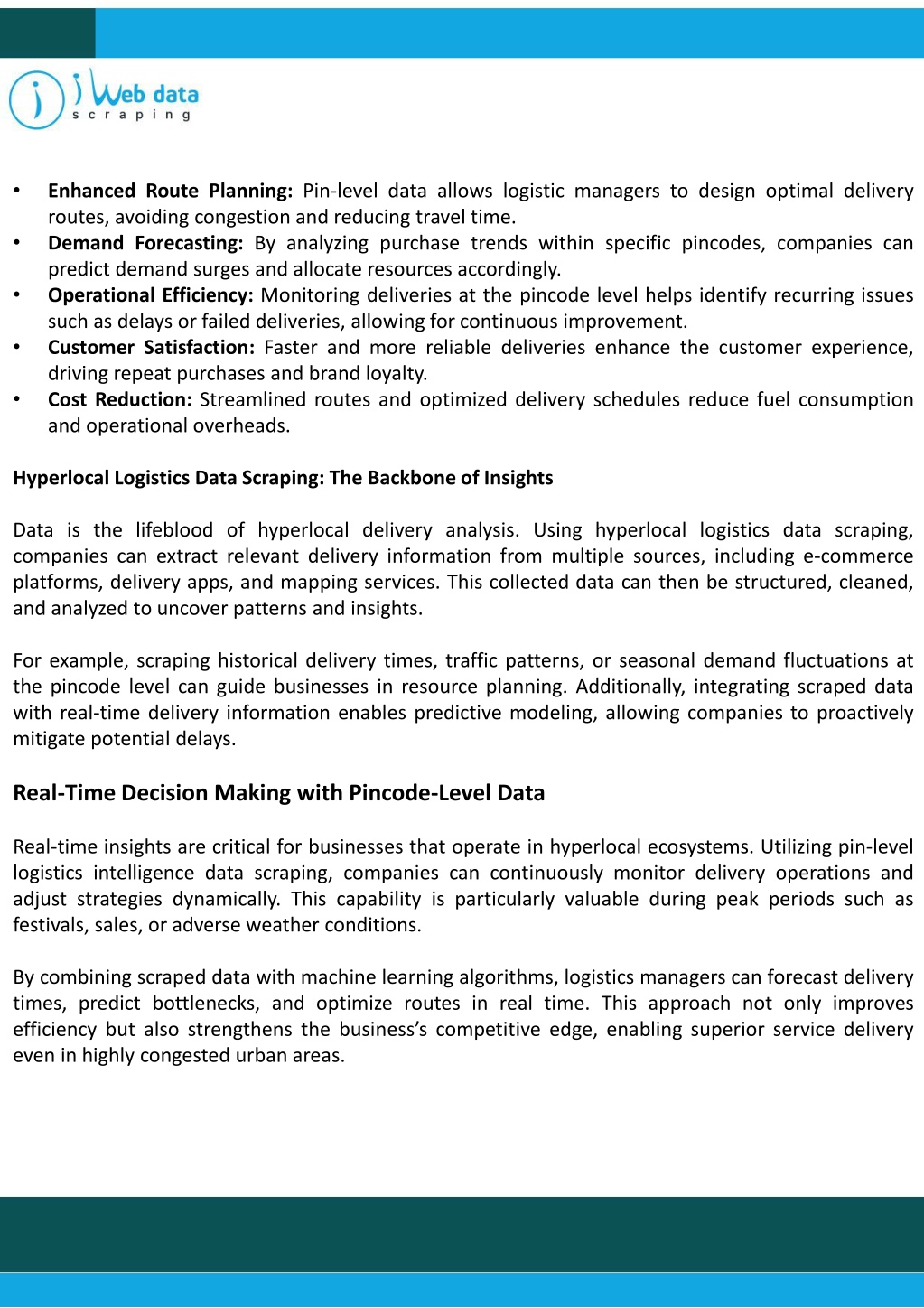 • Enhanced Route Planning: Pin-level data allows logistic managers to design optimal delivery routes, avoiding congestion and reducing travel time. Demand Forecasting: By analyzing purchase trends within specific pincodes, companies can predict demand surges and allocate resources accordingly. Operational Efficiency: Monitoring deliveries at the pincode level helps identify recurring issues such as delays or failed deliveries, allowing for continuous improvement. Customer Satisfaction: Faster and more reliable deliveries enhance the customer experience, driving repeat purchases and brand loyalty. Cost Reduction: Streamlined routes and optimized delivery schedules reduce fuel consumption and operational overheads. • • • • Hyperlocal Logistics Data Scraping: The Backbone of Insights Data is the lifeblood of hyperlocal delivery analysis. Using hyperlocal logistics data scraping, companies can extract relevant delivery information from multiple sources, including e-commerce platforms, delivery apps, and mapping services. This collected data can then be structured, cleaned, and analyzed to uncover patterns and insights. For example, scraping historical delivery times, traffic patterns, or seasonal demand fluctuations at the pincode level can guide businesses in resource planning. Additionally, integrating scraped data with real-time delivery information enables predictive modeling, allowing companies to proactively mitigate potential delays. Real-Time Decision Making with Pincode-Level Data Real-time insights are critical for businesses that operate in hyperlocal ecosystems. Utilizing pin-level logistics intelligence data scraping, companies can continuously monitor delivery operations and adjust strategies dynamically. This capability is particularly valuable during peak periods such as festivals, sales, or adverse weather conditions. By combining scraped data with machine learning algorithms, logistics managers can forecast delivery times, predict bottlenecks, and optimize routes in real time. This approach not only improves efficiency but also strengthens the business’s competitive edge, enabling superior service delivery even in highly congested urban areas.
